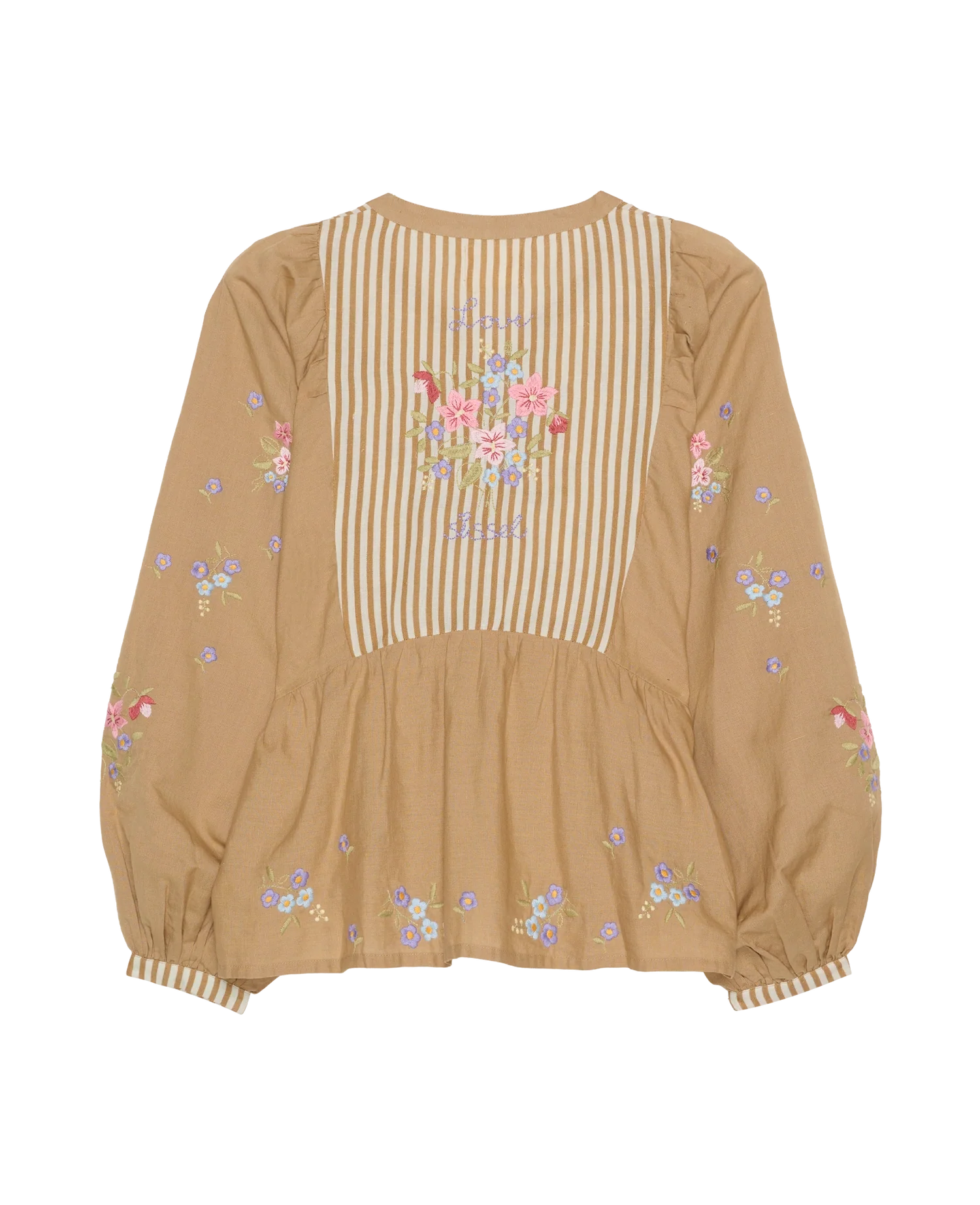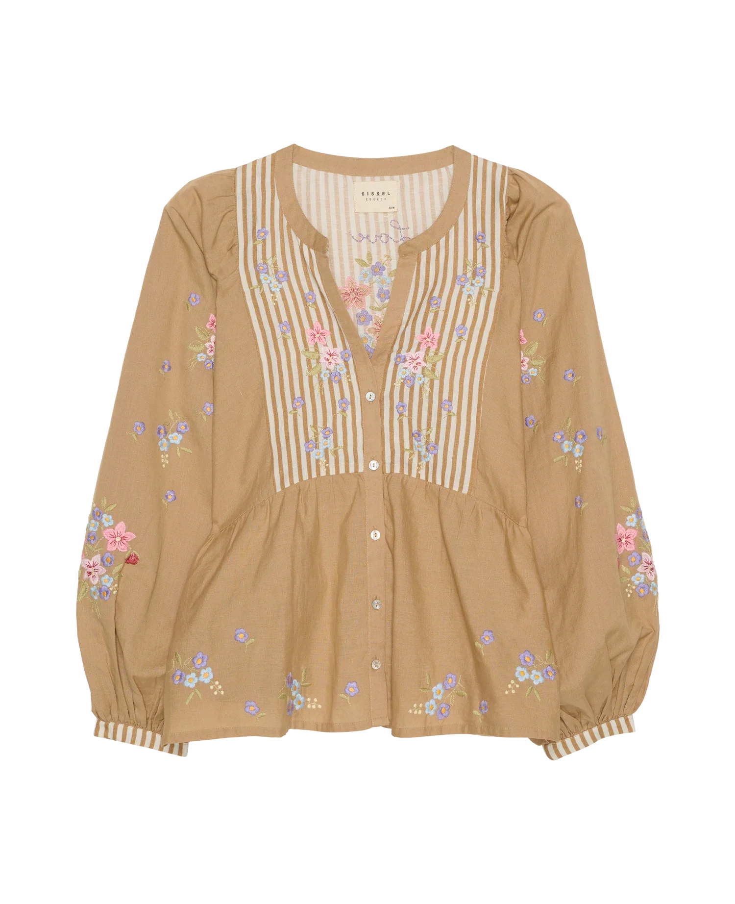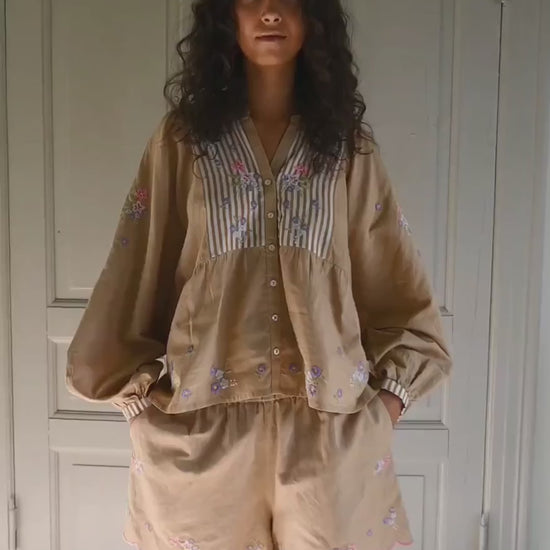 Toppen har brede ballonærmer og en talje med rynker. Den har en frontstolpe med lyse perlemorsknapper. Toppen er dekoreret med poetisk blomsterbroderi i en kontrastfarve, der er placeret over det hele som en dekorativ detalje.
