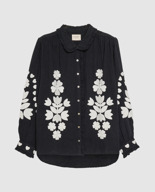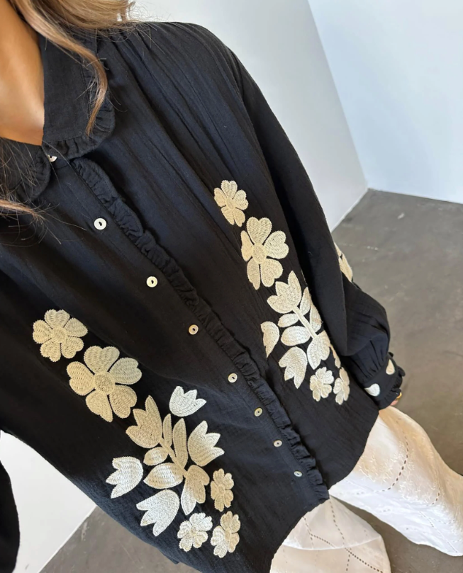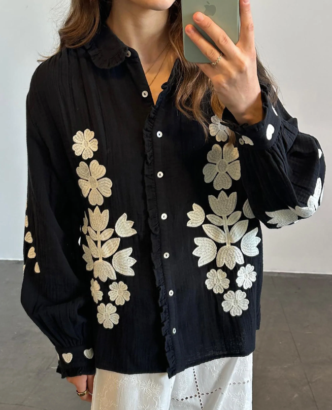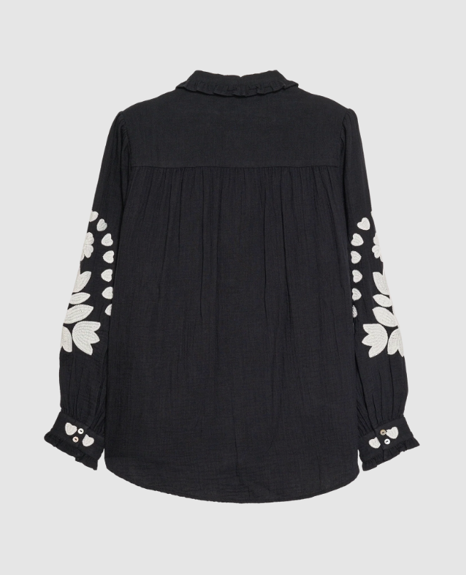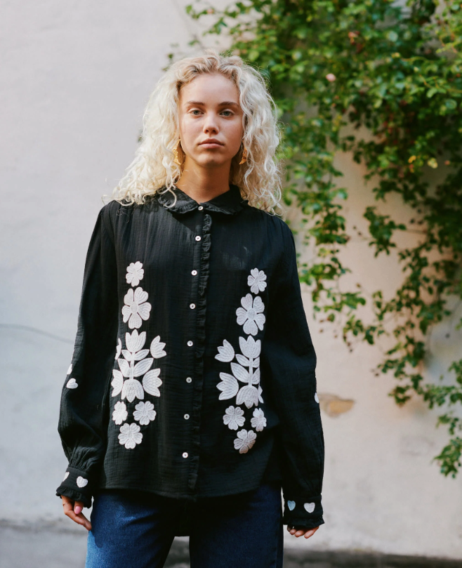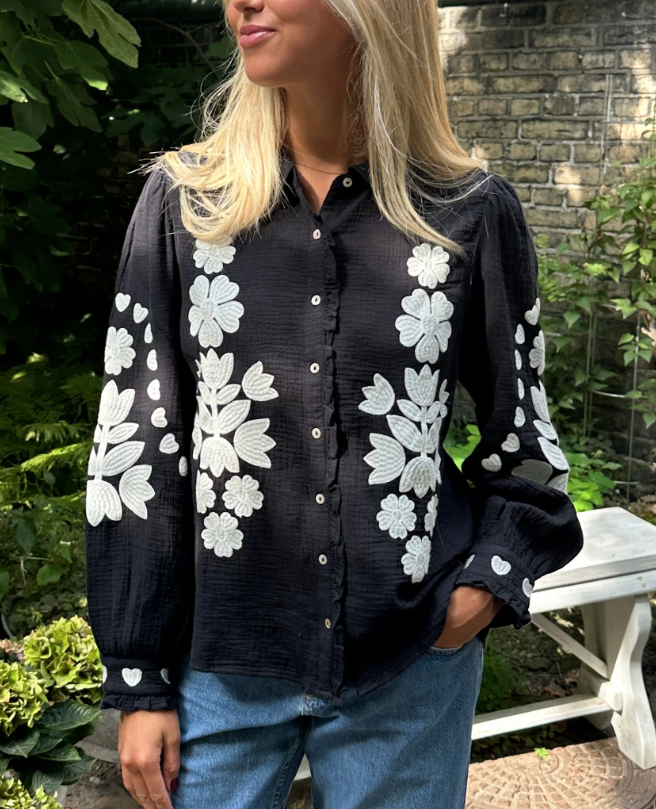 Skjorten har en let flæsekrave og en fin stolpelukning med lyse perlemorsknapper. Den er udsmykket med kontrasterende broderi med et grafisk blomster- og hjertedesign.