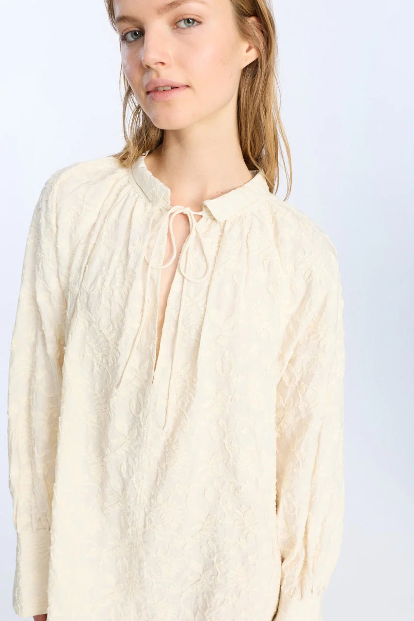 Kjole med en struktureret jacquard-overflade, lige pasform, lange, let voluminøse ærmer med markerede ærmegab, en afrundet krave og en sløjfedetalje ved kraven i denne lækre farve creme fra MUNTHE.