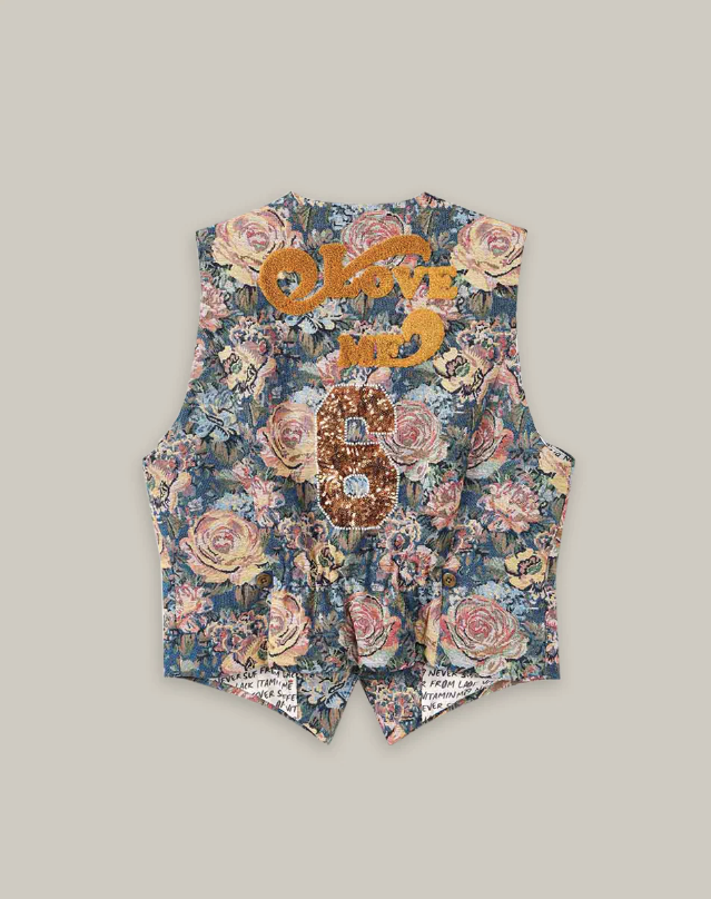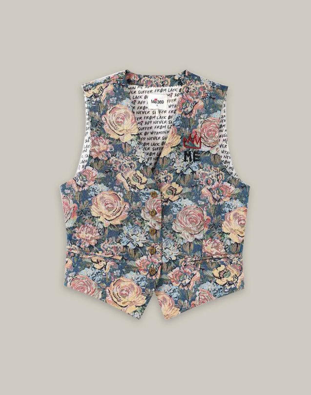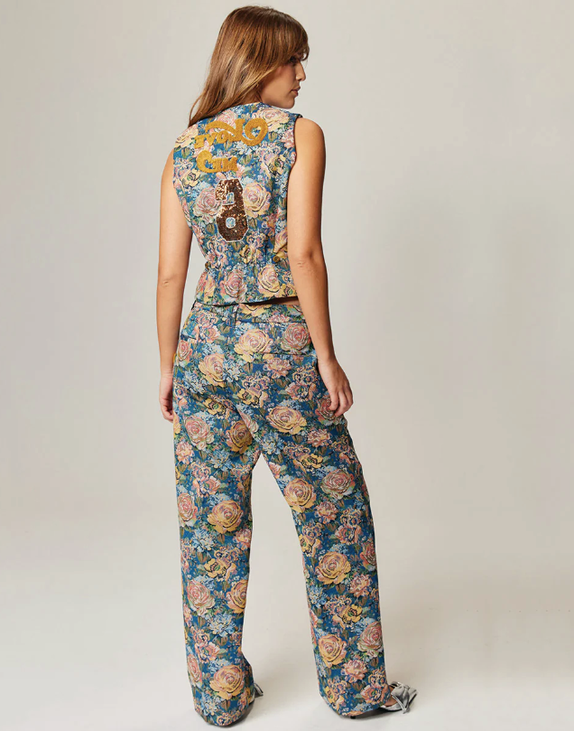 Smuk vest i det smukke print med statement på ryggen fra Me369. Der er tilhørende bukser til som et sæt, men ellers brug vesten til kjoler eller jeans