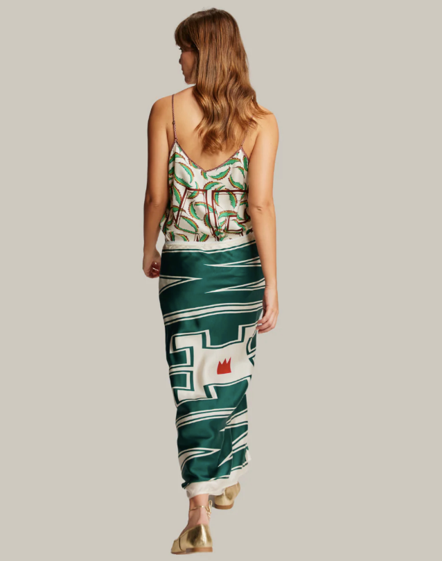 Henrivende smuk Maxi-nederdel fra ME369. Nederdelen er med elastisk i taljen og i et yderst smukt viskose print.