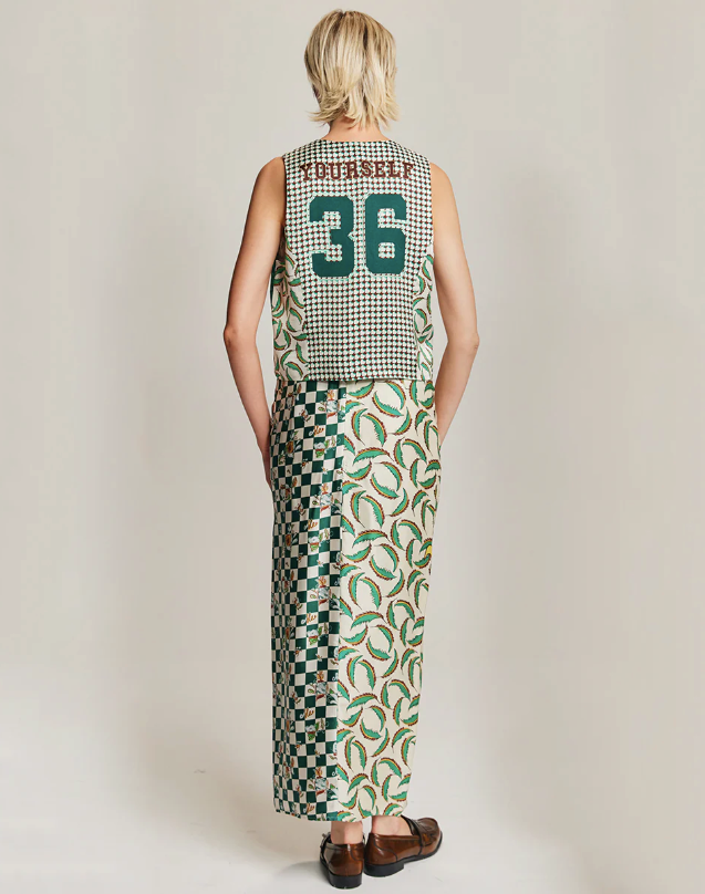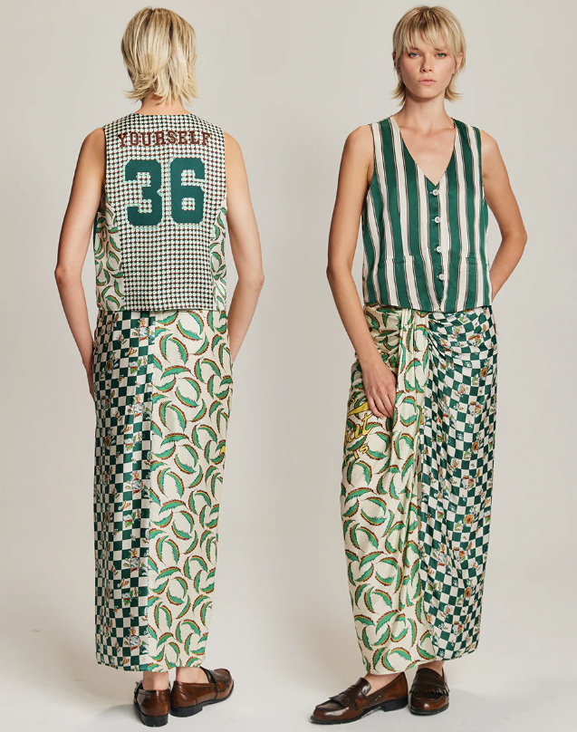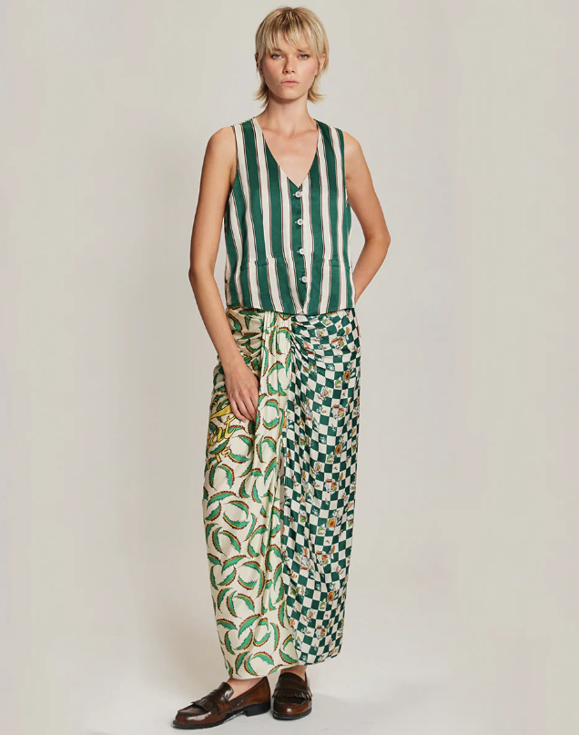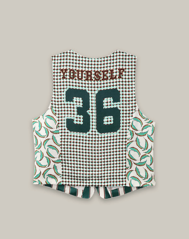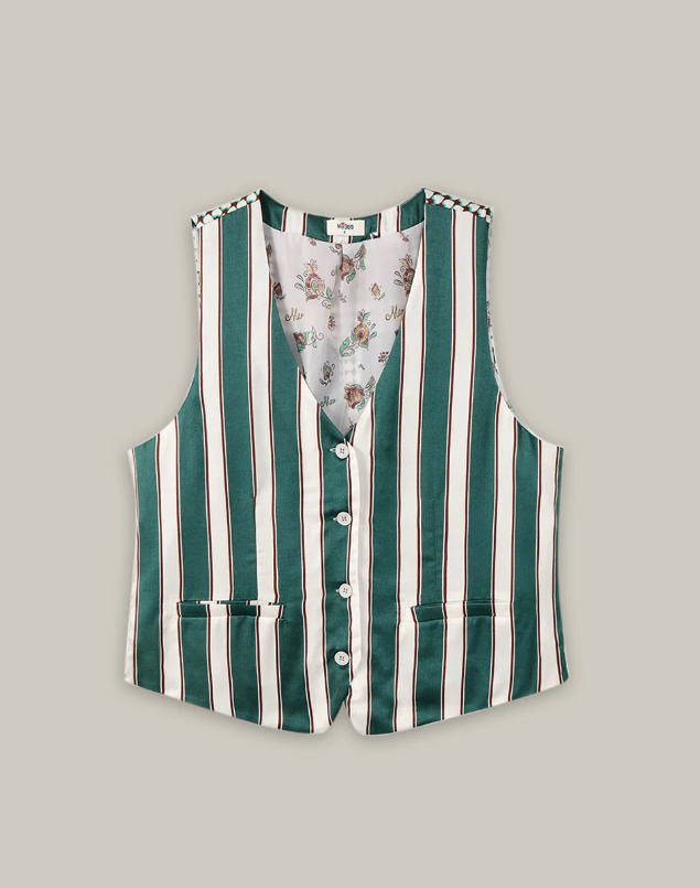 Smuk viskose vest fra ME369. Vesten er med dyb V-hals vest med knapper samt i et flot mønstret print.