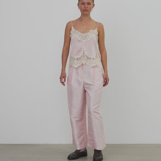 Top i et let, glat stof med justerbare stropper og en fin blondekant ved halsudskæring og kant fra STELLA NOVA i denne sarte rosa farve.