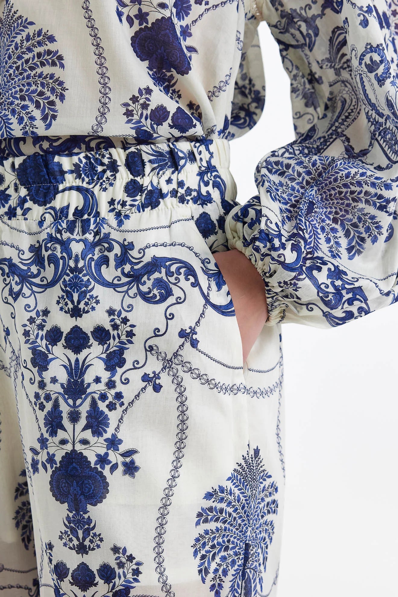 Lækre tynde bukser i et meget smukt print i blå/hvid fra Devotion Twins. Denne buks er med lommer og lige ben.