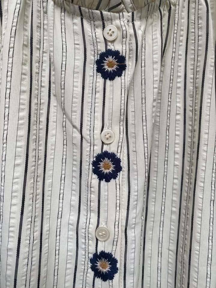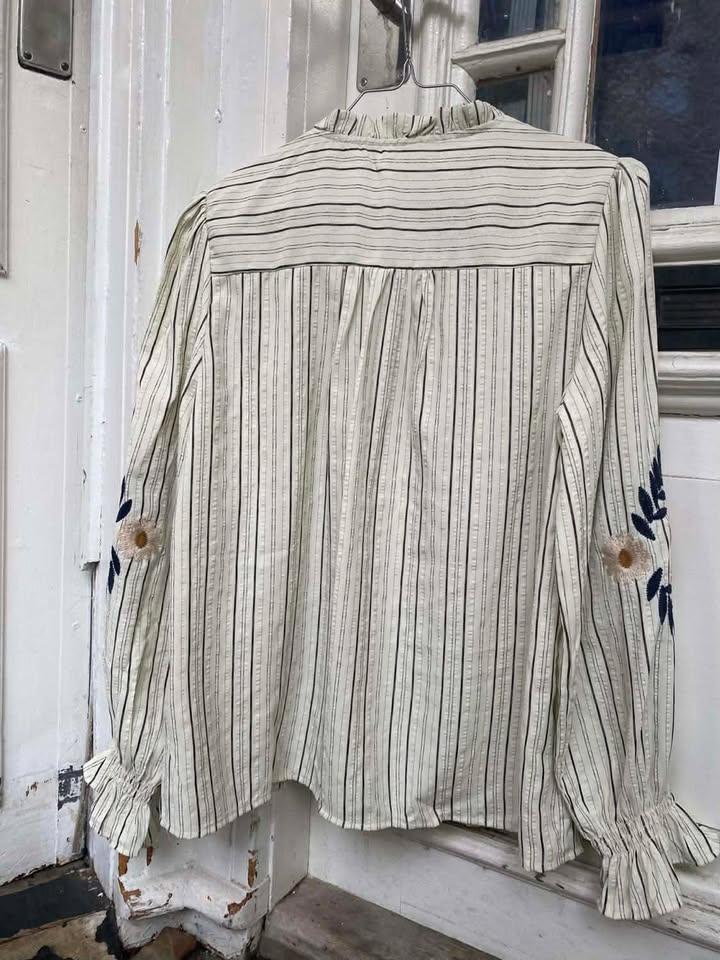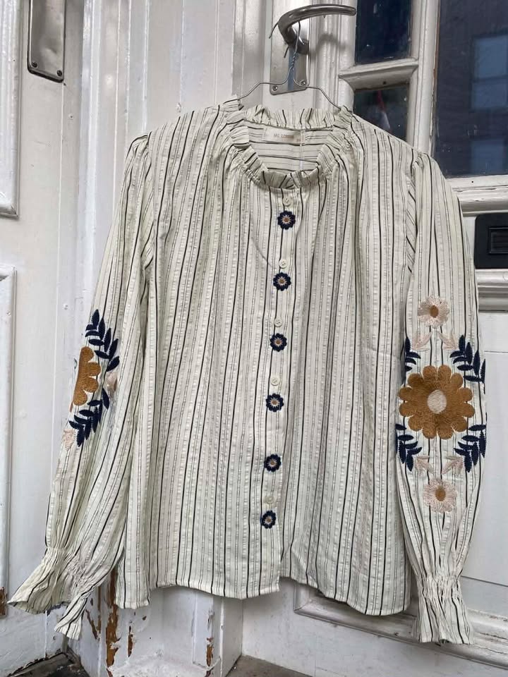 Smuk bluse med broderet blomster fra BY LUND. Blusen er med rund hals med frynser, langer ærmer med en lille elastik ved håndledet samt smukke broderede blomster.