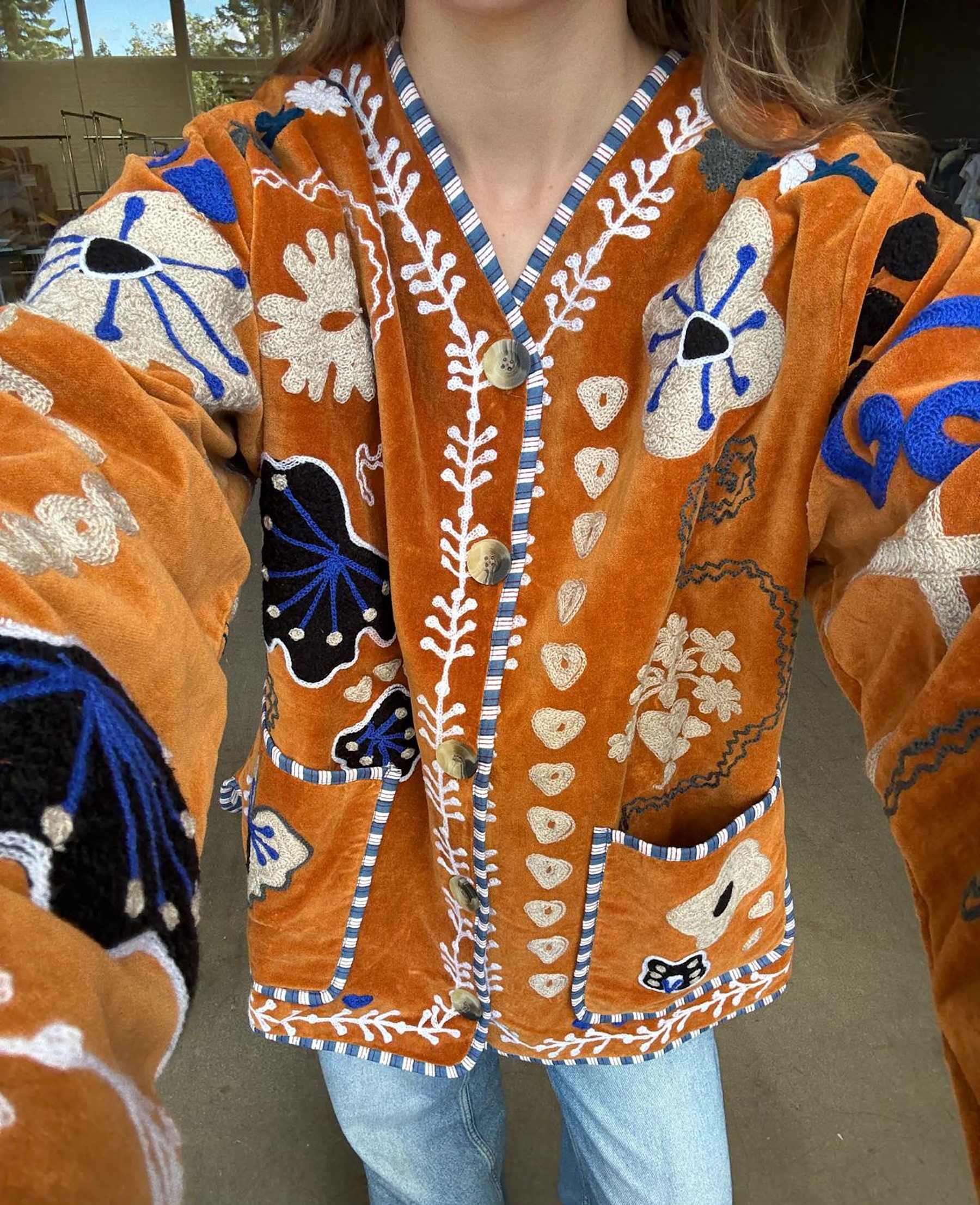 Dette Suzani-broderede produkt er dekoreret med den manuelt styrede kædestingteknik fra Suzani-broderi Maggie Jacket fra Sissel Edelbo.