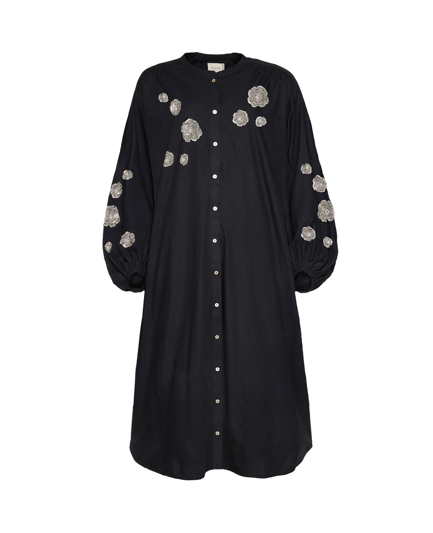 Kjolen har sænkede skuldre, og de brede ballonærmer er lavet med rynker og har en smal manchet ved ærmeåbningen. Denne model har en feminin rund halsudskæring med en smal krave, en stolpelukning med perlemorsknapper og lommer i sidesømmene. Den er smukt udsmykket med blomster lavet af pailletter, perler og rhinsten, arrangeret i et uregelmæssigt mønster på tværs af den øverste del af forsiden og ærmerne.