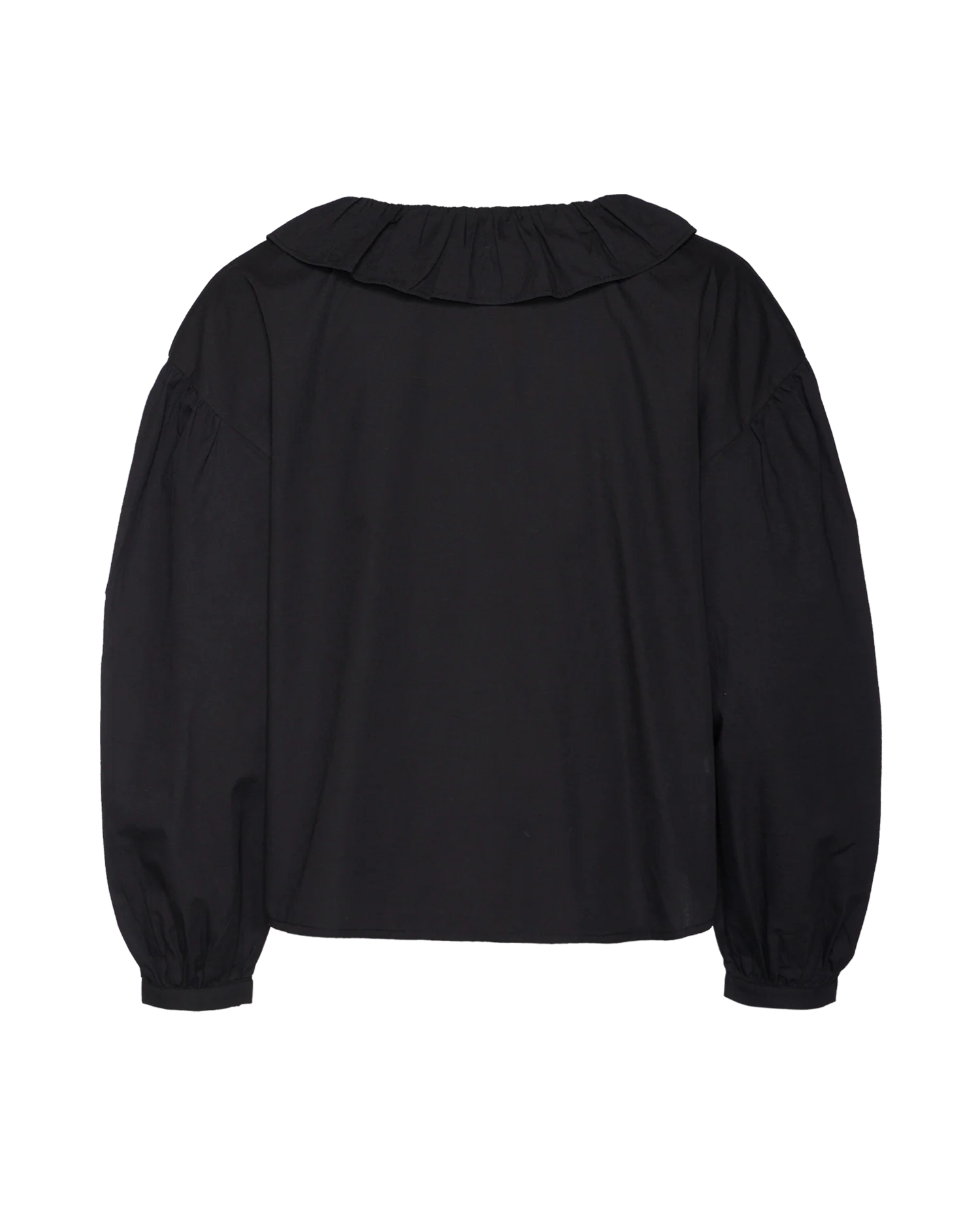 Ærmerne er lange og voluminøse, samlet med smalle manchetter ved åbningerne. Halsudskæringen er rund og afsluttet med en delikat flæsekrave.