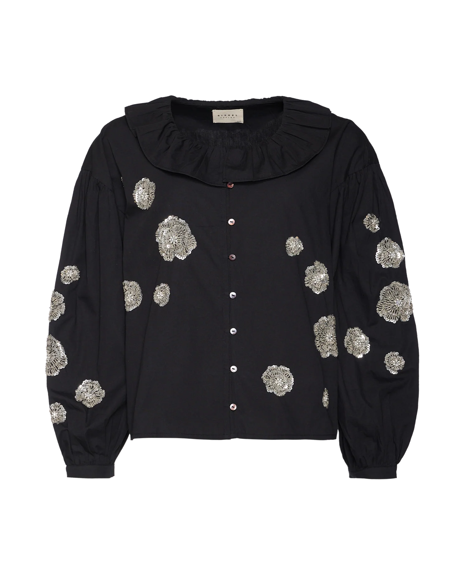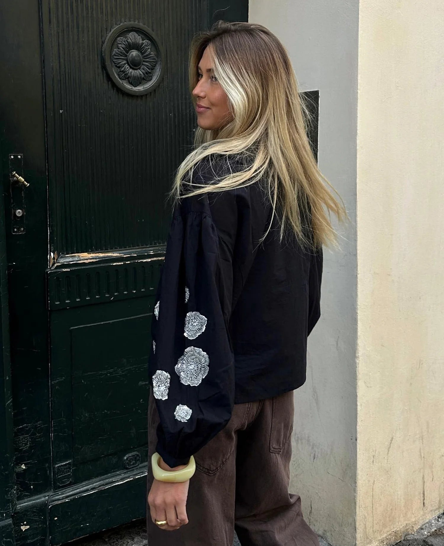 Skjorten lukkes ved stolpelukning foran med mørke perlemorsknapper og elastiske stropper. Den er smukt udsmykket med blomster lavet af pailletter, perler og rhinsten, arrangeret i et uregelmæssigt mønster på tværs af forsiden og ærmerne.