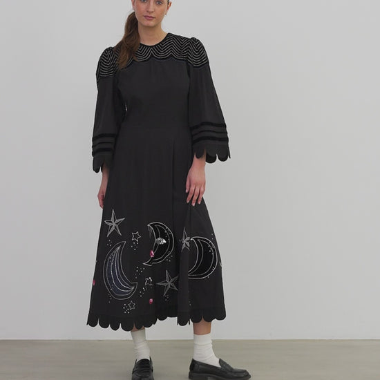 MOON AND STAR EMBROIDERED MIDI DRESS - BLACK