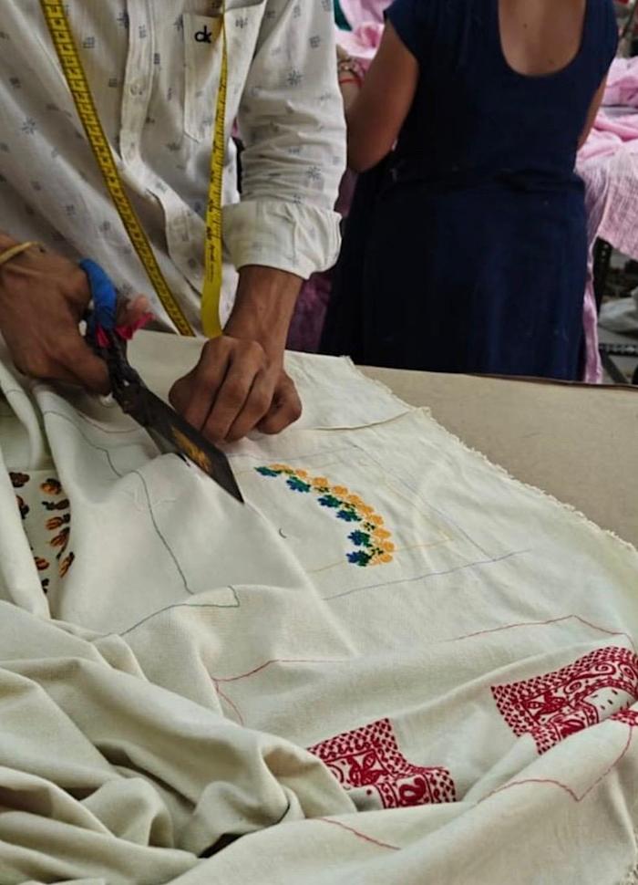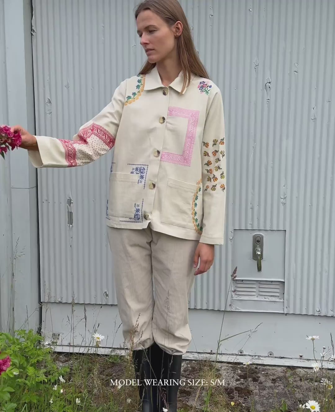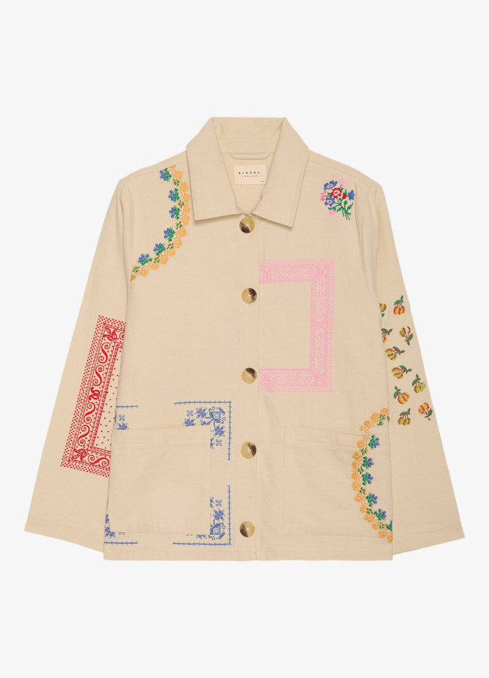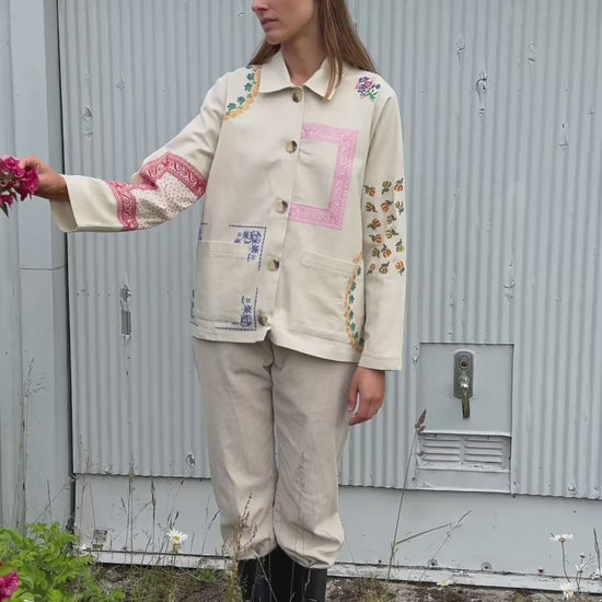 Jakken har en lille skjortekrave og lange ærmer. Den har to lommer og en stolpelukning med knapper i benlignende udseende foran. Jakken er dekoreret med farverige og poetiske broderede kunstværker inspireret af vintage servietter.