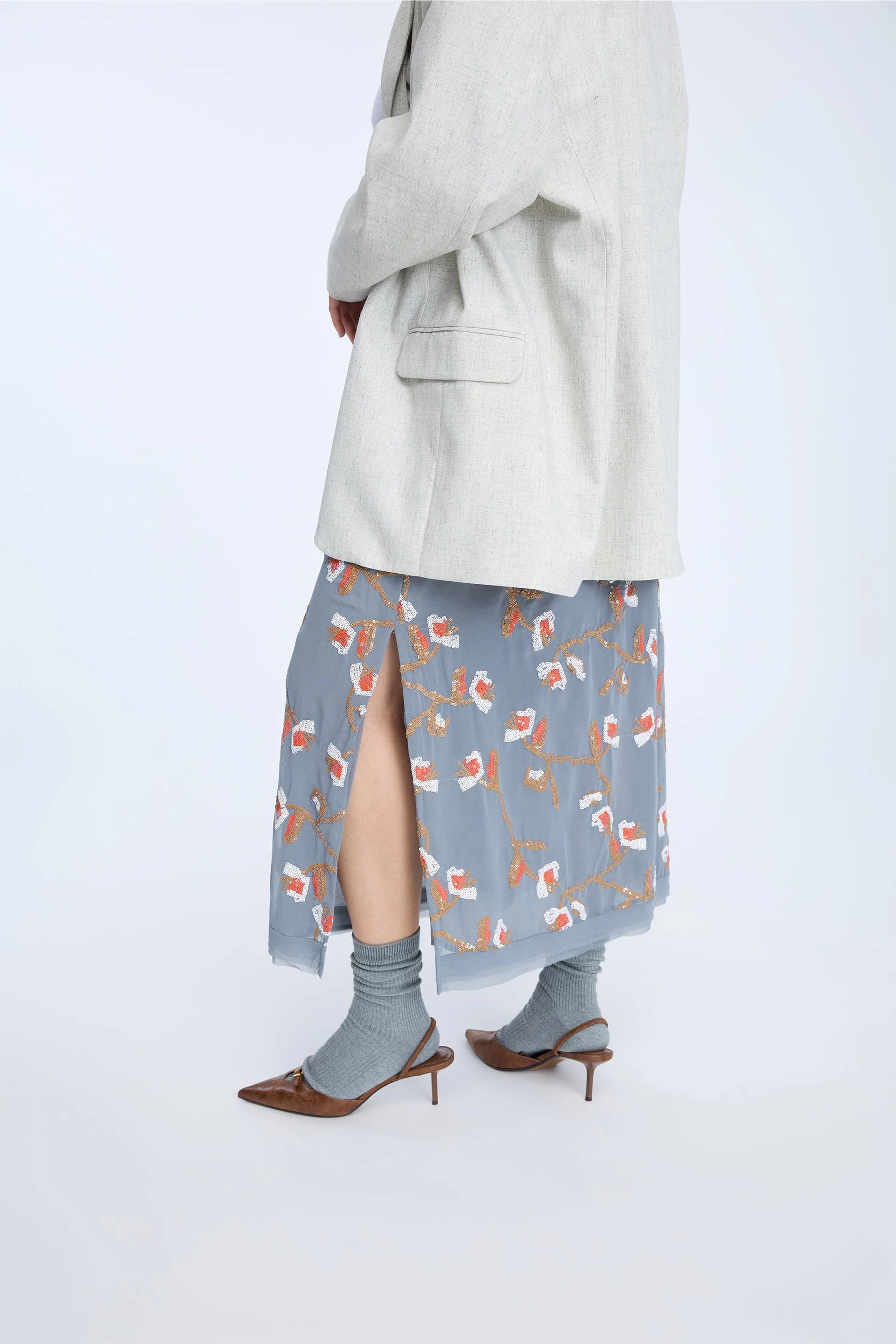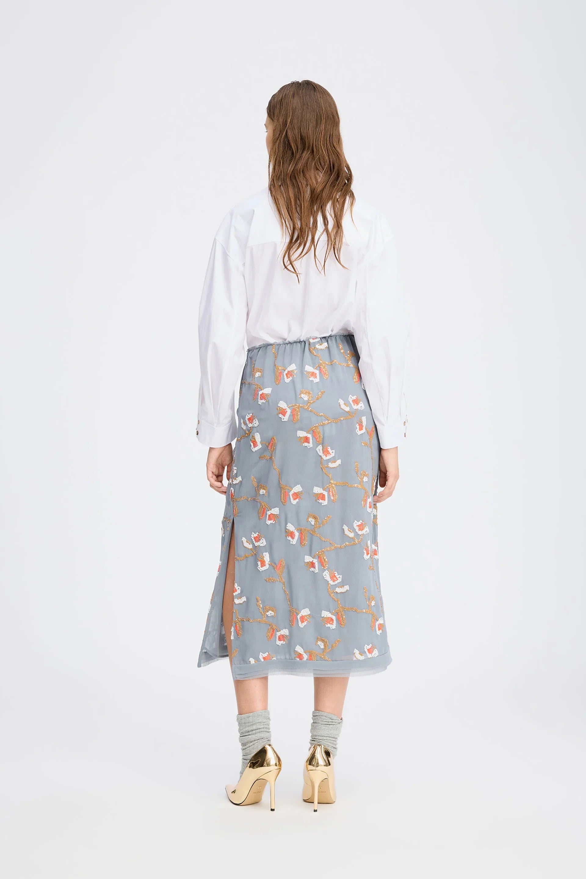 Nederdel med et smukt mønster af pailletblomster i varme nuancer OMI fra MUNTHE.
