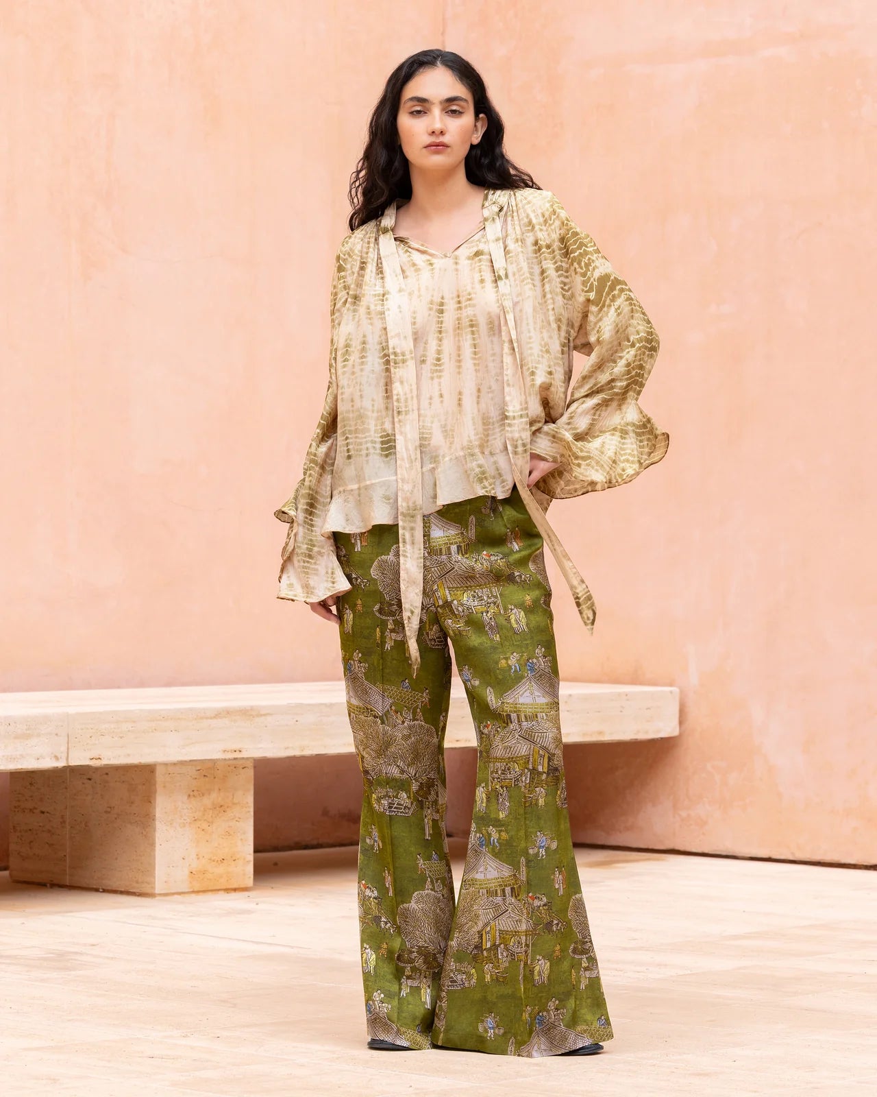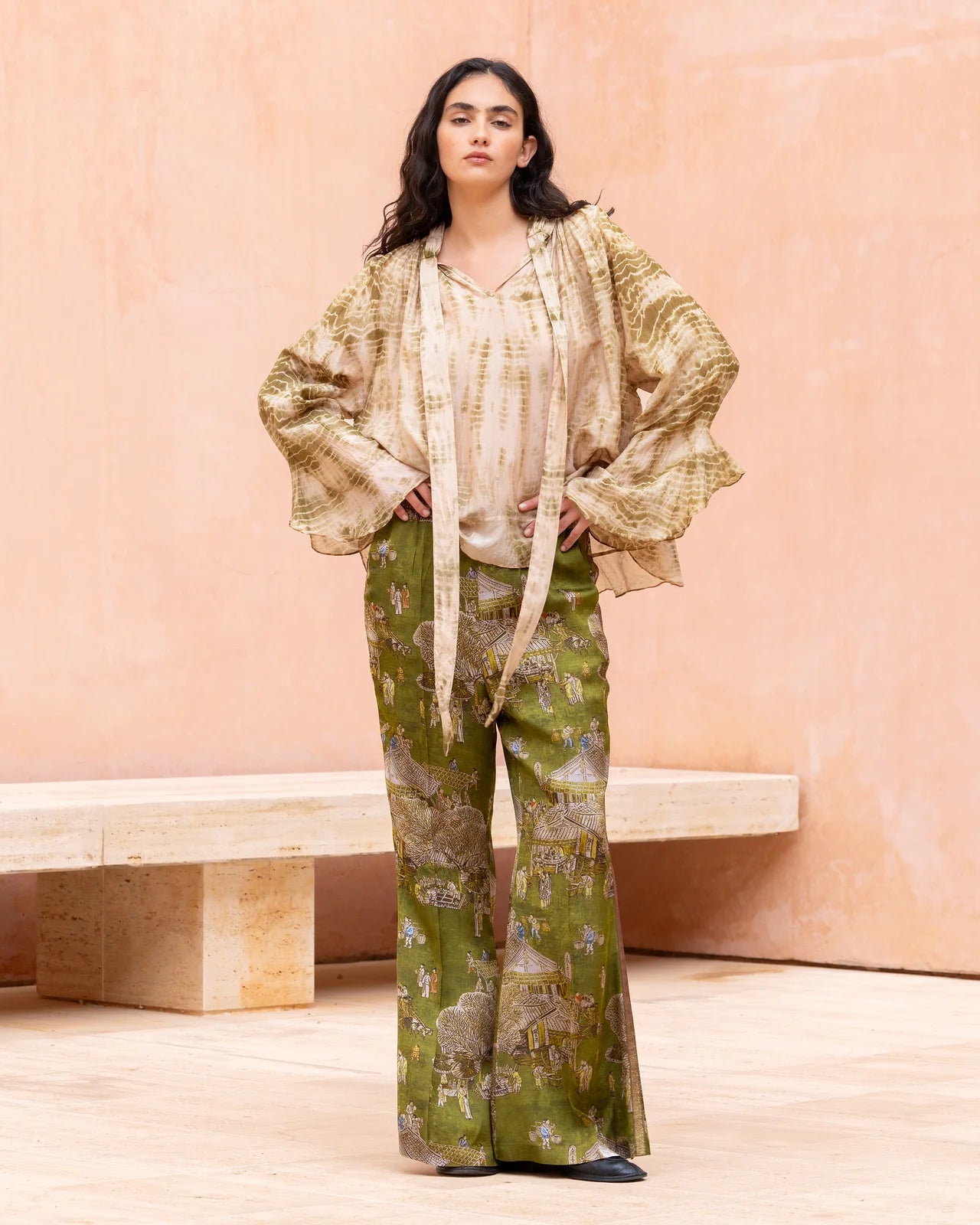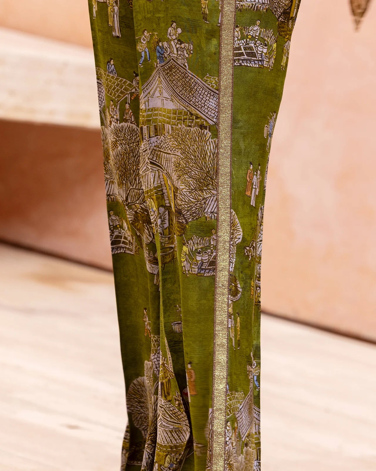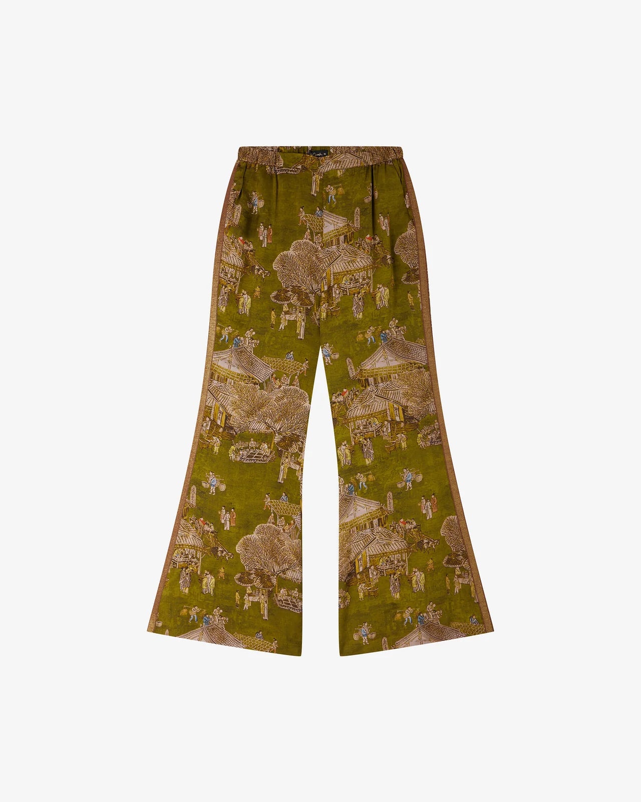 Lækre svajede bukser i trykt viskose jacquard på en dybgrøn baggrund blander komfort og halvfjerdser-stil PIKINI fra MES DESMOISELLES.