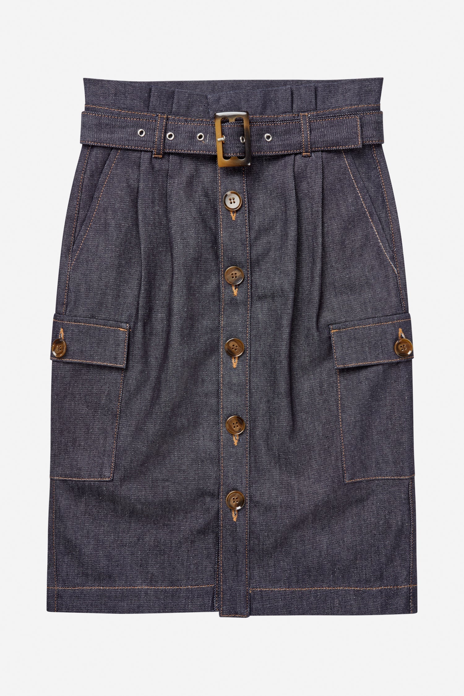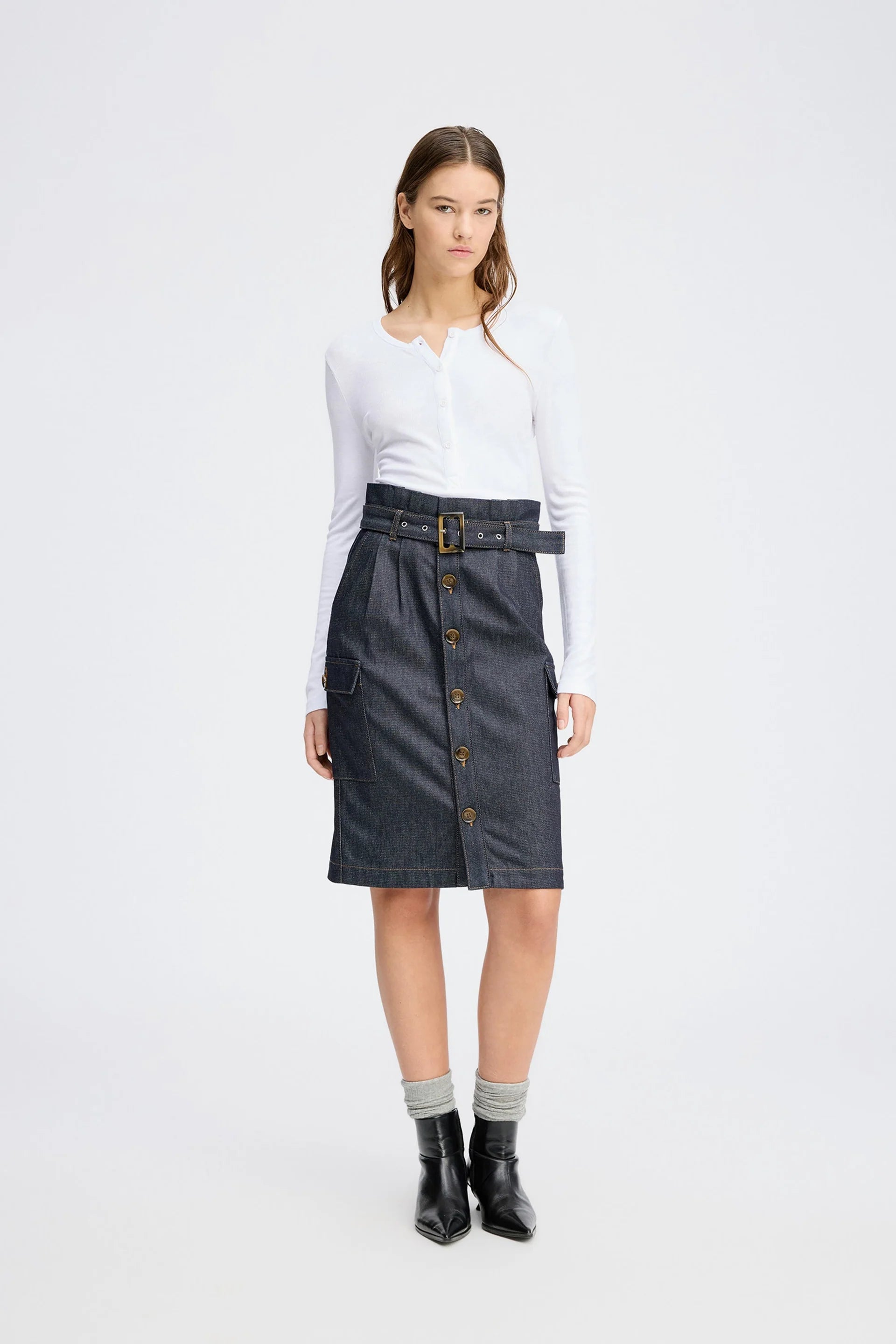 Elegant højtaljet denimnederdel med knaplukning foran, aftageligt bælte og statement flaplommer i siden fra MUNTHE.
