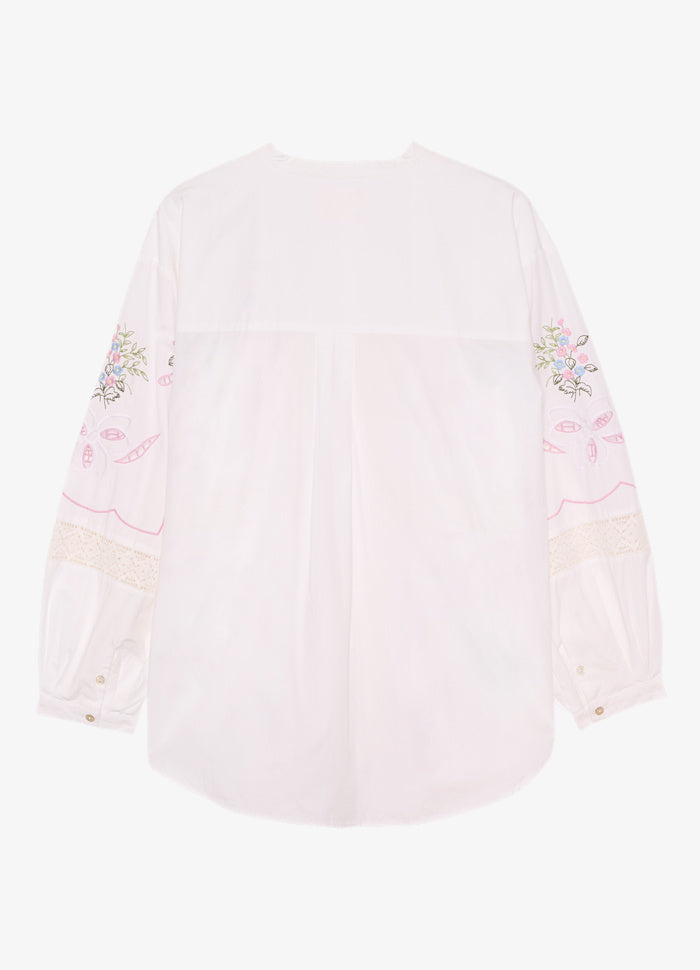 Sada Shirt har en løs, lige pasform og er lavet i økologisk bomuld fra SISSEL EDELBO. Den har lange ærmer med knappede, smalle manchetter og en o-halsudskæring med en smal standkrave, der lægger sig blidt omkring halsen. Den forreste stolpelukning er afsluttet med perlemorsknapper til lukning. Et bærestykke med en bokslæg midt bagpå giver en behagelig pasform, mens den buede kant blødgør silhuetten. Skjorten er dekoreret med poetisk broderi inspireret af en vintage dug og detaljeret med smukt blondebånd.