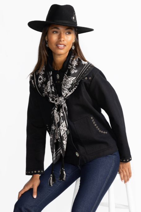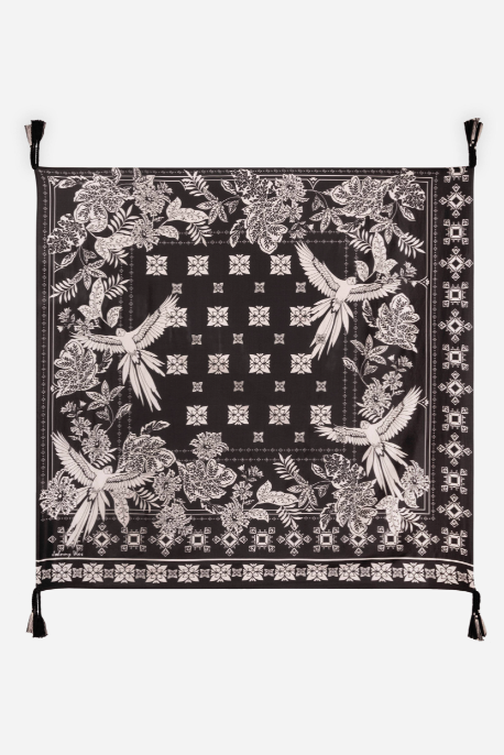 Smukt sort hvidt silketørklæde fra Johnny Was, lavet i en ren luksuriøs silke. Silketørklædet er designet i et utrolig smukt mønster. Tørklædet er et smukt tilbehør og er afsluttet i hvert hjørne med en dekorativ kvast.