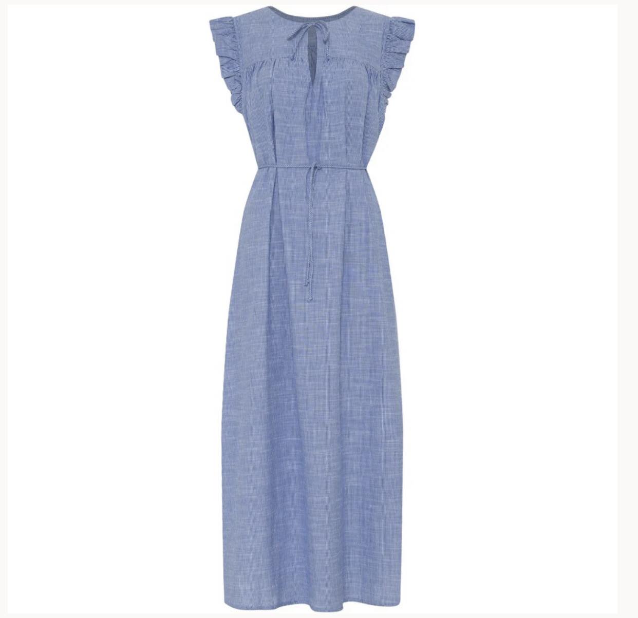 Stockholm kjolen fra FRAU har en fin flæse ved ærmet og et bindebånd bagpå. Kjolen kan vendes, hvis du ønsker en lidt dybere v-udskæring på front istedet. Kjolen har to sidelommer og der medfølger bælte, hvis du ønsker at markere taljen.
