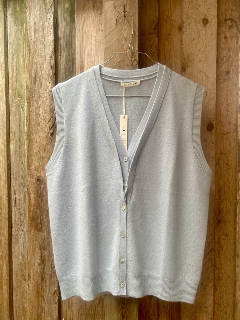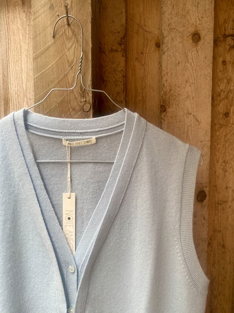 Utrolig smuk strikvest fra NOTE ANECDOTE. Strikvesten er designet med en smuk dyb V-udskæring samt knaplukning i fronten. Afsluttet med en fin ribkant forneden.