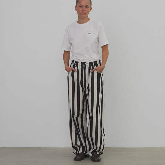 Baggy lavtaljede bukser med lige ben i stribet creme/black fra STELLA NOVA.