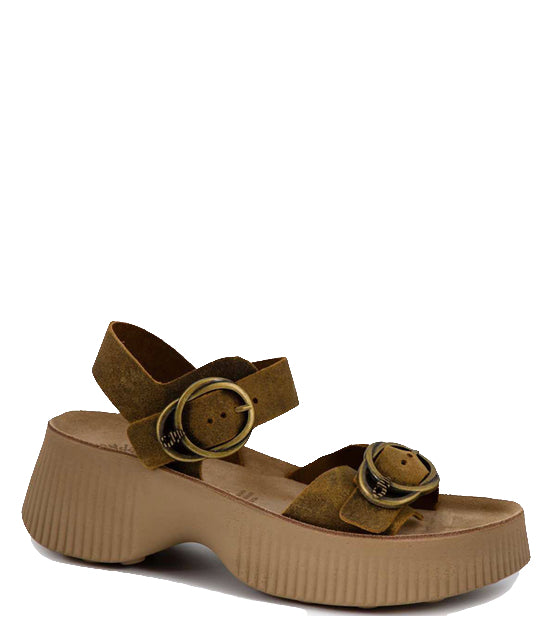 Smuk sandal Yvonne fra Cabana Living. Sandalen er designet med store spænder i armygrøn ruskind og med en let plateau.